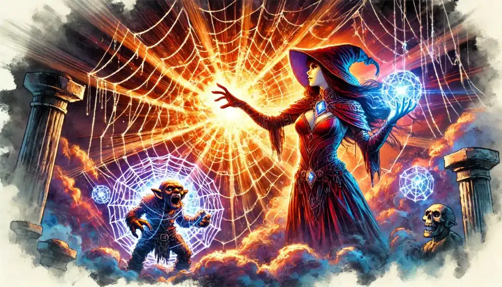 The synergy of Web and Fireball creates a devastating trap that both restrains and incinerates foes in a single stroke. Picture this: a battlefield ensnared in thick, sticky webs, catching unsuspecting enemies in its grip. The Web spell blankets an area in sticky strands, holding creatures fast unless they can break free with a Strength save. But here’s where it gets interesting—layer Fireball on top, an explosive spell infamous for its widespread destruction, igniting the web in a fiery blaze.